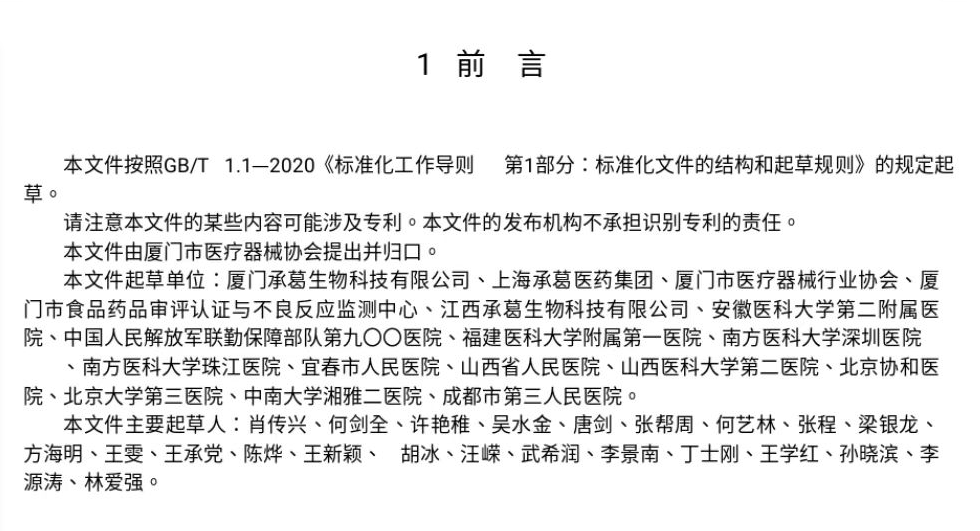 據(jù)了解,五項團體標準是由上海承葛醫(yī)藥集團牽頭起草,聯(lián)合廈門承葛生物科技有限公司、廈門市醫(yī)療器械行業(yè)協(xié)會、廈門市食品藥品審評認證與不良反應(yīng)監(jiān)測中心、江西承葛生物科技有限公司、安徽醫(yī)科大學第二附屬醫(yī)院、中國人民解放軍聯(lián)勤保障部隊第九00醫(yī)院、福建醫(yī)科大學附屬第一醫(yī)院、南方醫(yī)科大學深圳醫(yī)院、南方醫(yī)科大學珠江醫(yī)院、宜春市人民醫(yī)院、山西省人民醫(yī)院、山西醫(yī)科大學第二醫(yī)院、北京協(xié)和醫(yī)院、北京大學第三醫(yī)院、中南大學湘雅二醫(yī)院、成都市第三人民醫(yī)院等16家單位參與制定。承葛醫(yī)藥集團董事長肖傳興作為標準主要起草人之一。