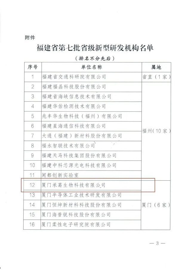 近日,福建省科技廳公布福建省第七批省級新型研發(fā)機構名單。經(jīng)過評審,廈門承葛生物科技有限公司(簡稱“承葛生物”)被確立為福建省第七批省級新型研發(fā)機構。本批次全省共36家單位(其中廈門市6家)獲得此榮譽。通過評審,廈門承葛生物科技有限公司(簡稱“承葛生物”)被確立為福建省第七批省級新型研發(fā)機構。這是承葛生物繼2021年獲得廈門市新型研發(fā)機構稱號后,在技術研發(fā)、創(chuàng)新創(chuàng)業(yè)方面再次獲得相關部門和社會的認可。